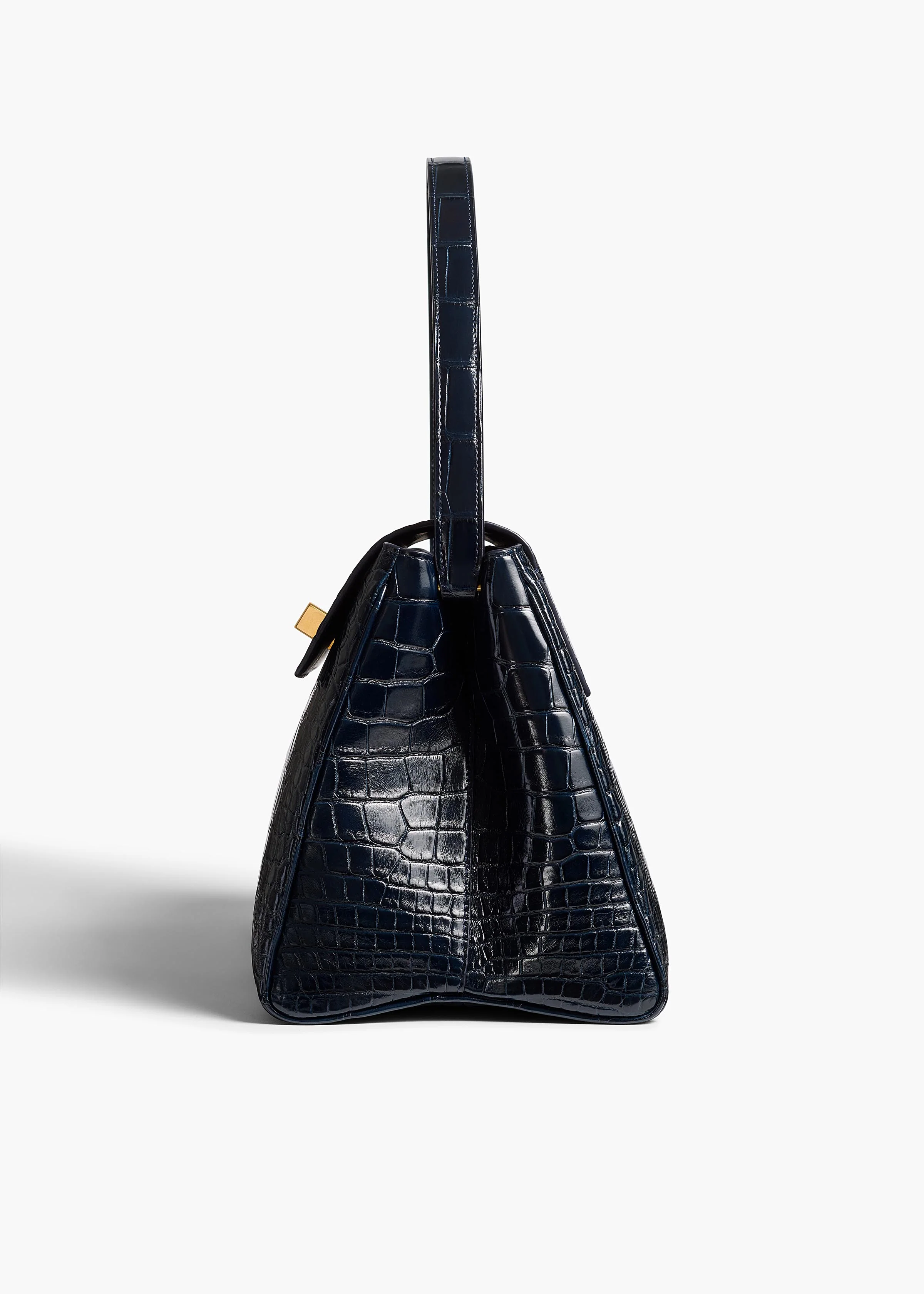 A flap-top bag that combines sculptural volume with refined structure. Crafted in Italy of geniune alligator leather, prized for its durability and natural sheen. Signature Empire hardware at magnetic closure. Internal slip pocket.
