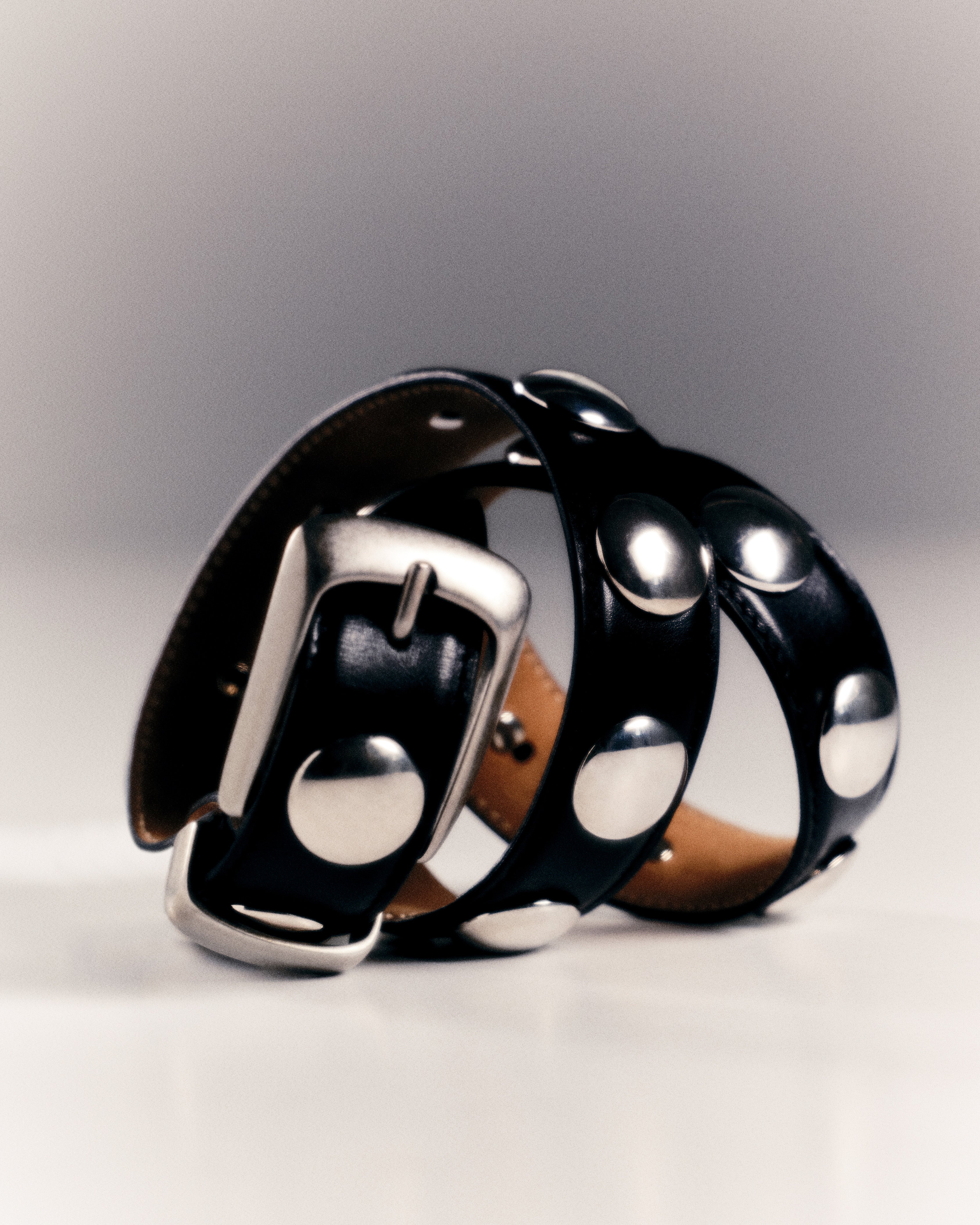 Crafted in Italy of lustrous calfskin with tonal topstitching, it is accented with gleaming, jewelry-like hardware: polished silver-toned discs paired with a brushed buckle, loop, and tip.