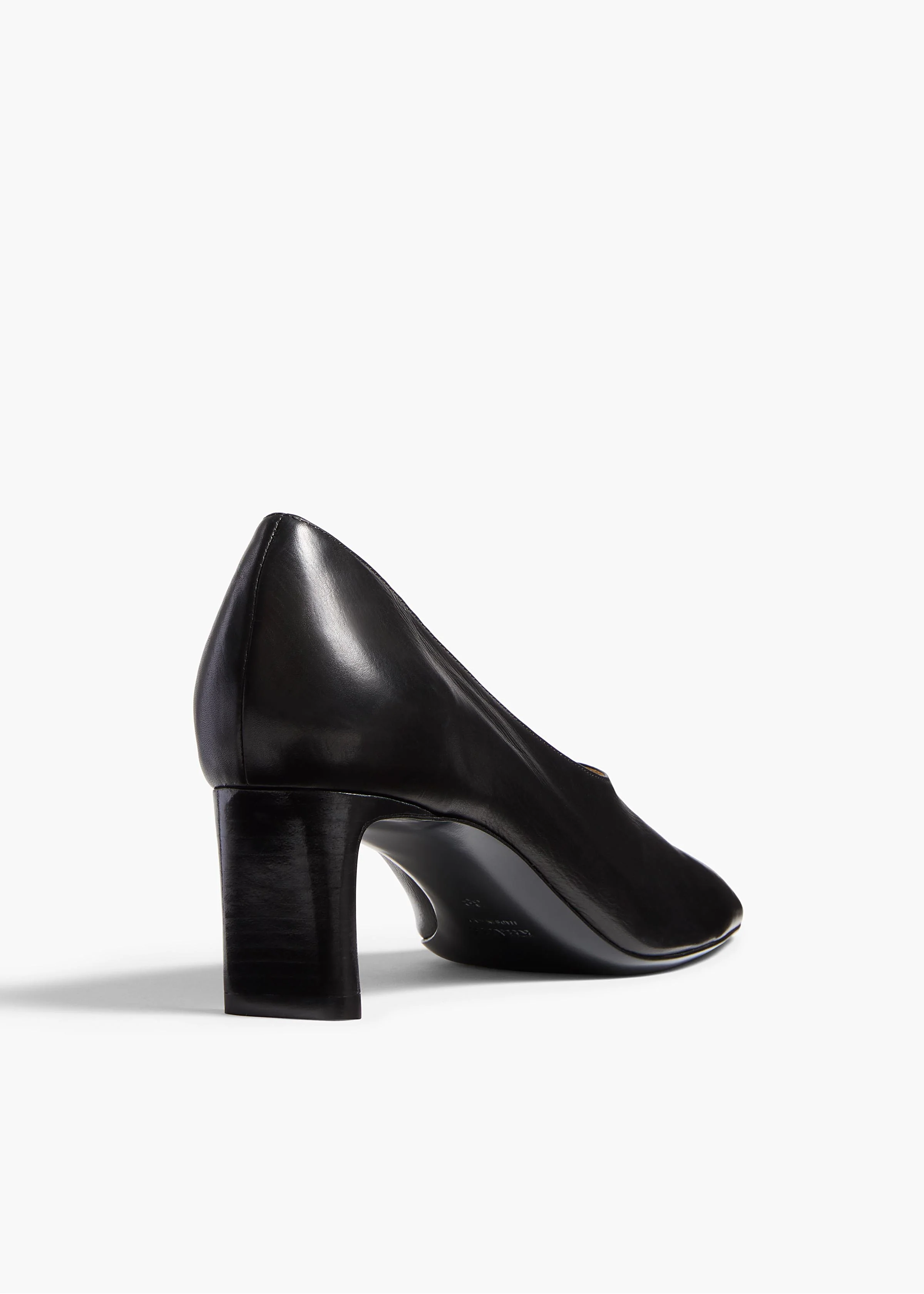 A refined calfskin pump designed to gently embrace and visually slim the foot. Crafted in Italy to be exceptionally lightweight. Signature details include sculptural Ona heel and gold staple detail at vamp.