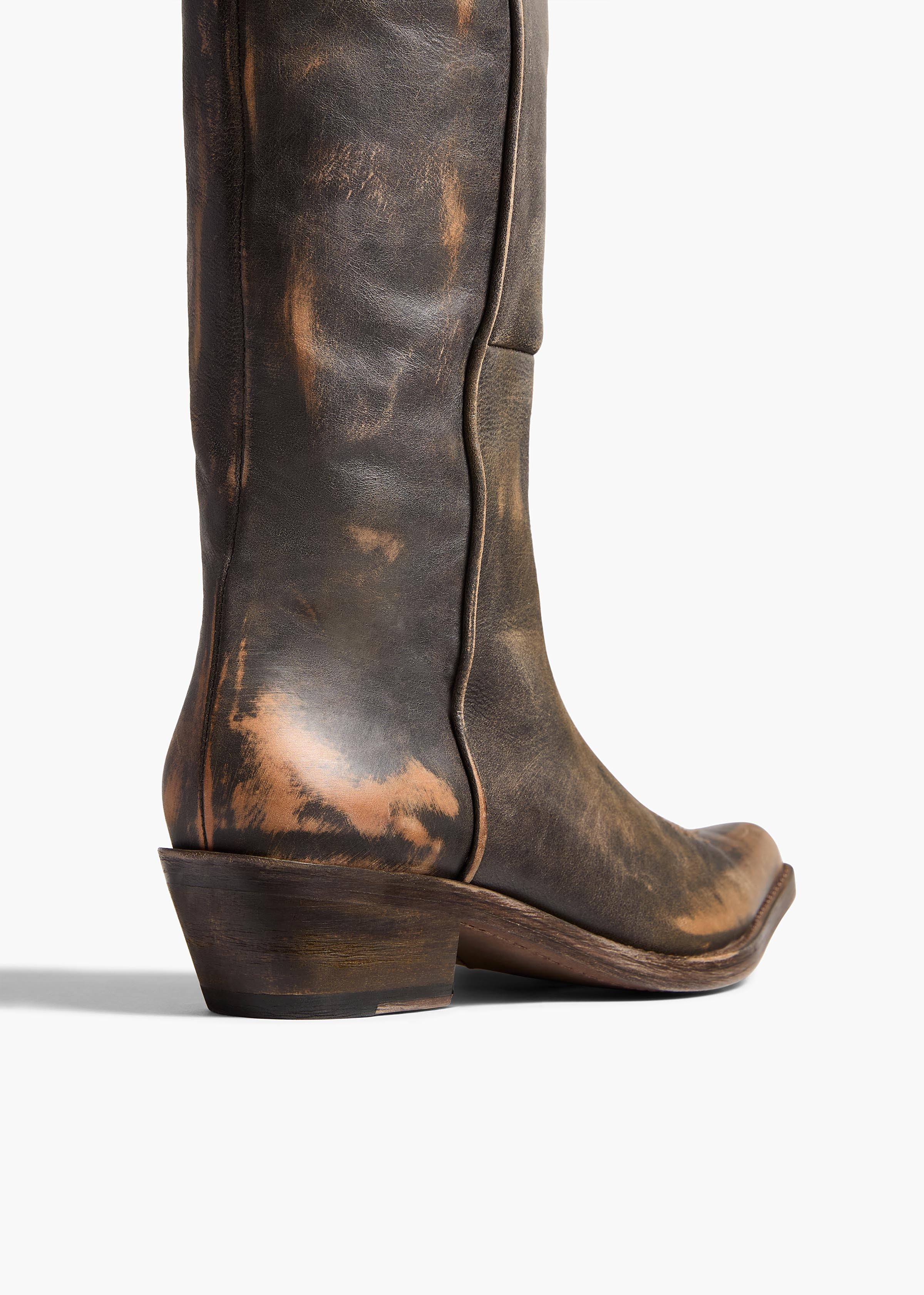 A sharp yet rustic boot inspired by well-worn Western classics. Snip-toe silhouette in hand-worked, two-tone calfskin. Tonally stitched welt and stacked heel of patinated leather. Goatskin lining. Pulls on.