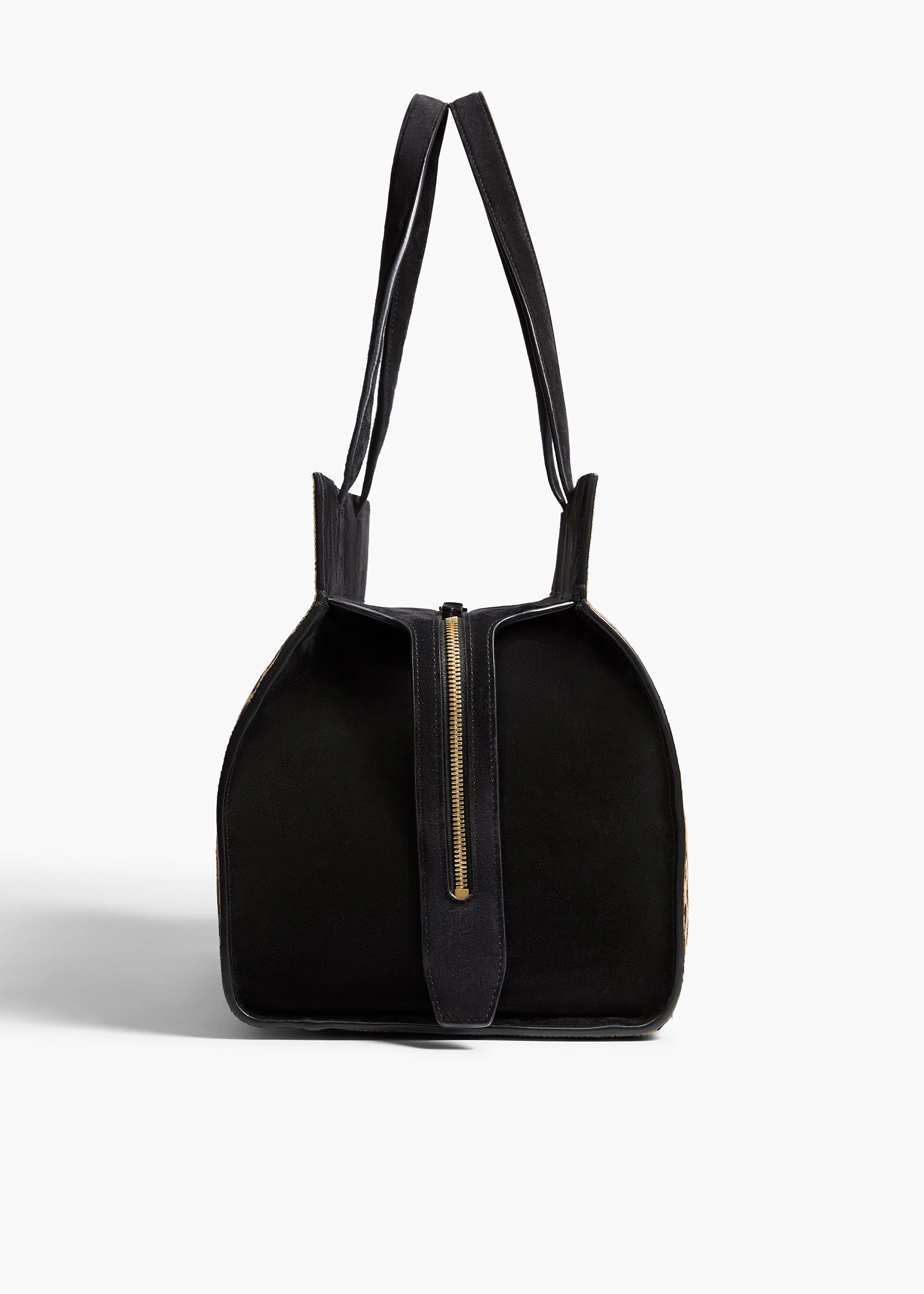 A clean-lined zip-top carryall designed to fit daily essentials with ease. Crafted in Italy of playfully spotted haircalf accented with velvety suede. Twinned straps to carry on the shoulder or by hand. Spacious interior illuminated by bonded lining of velvety suede. Includes zippered pouch that doubles as a clutch.