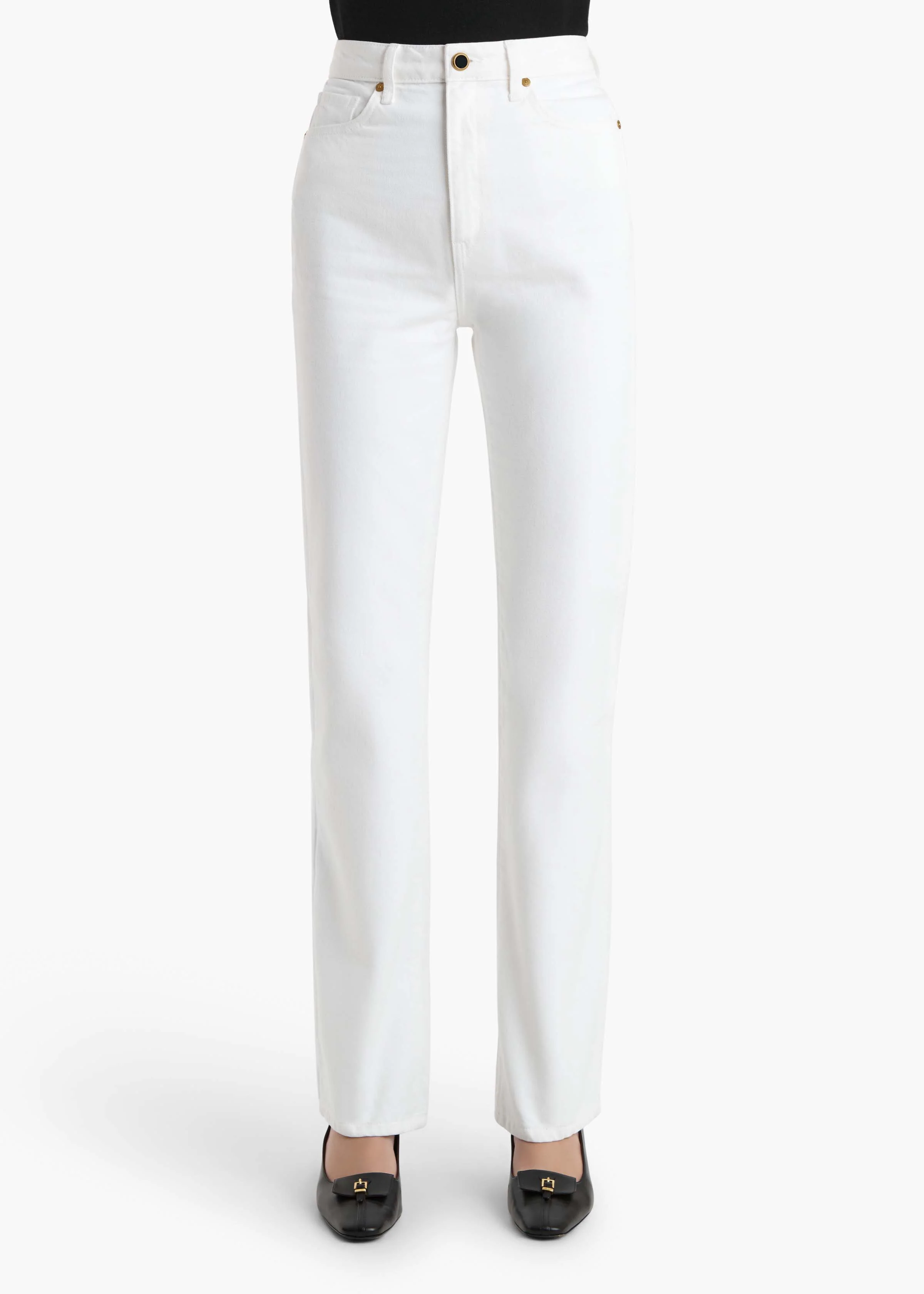 Designed to visually elongate the legs, these high-rise jeans flatter with a stovepipe silhouette in pure cotton denim. Finished by hand.