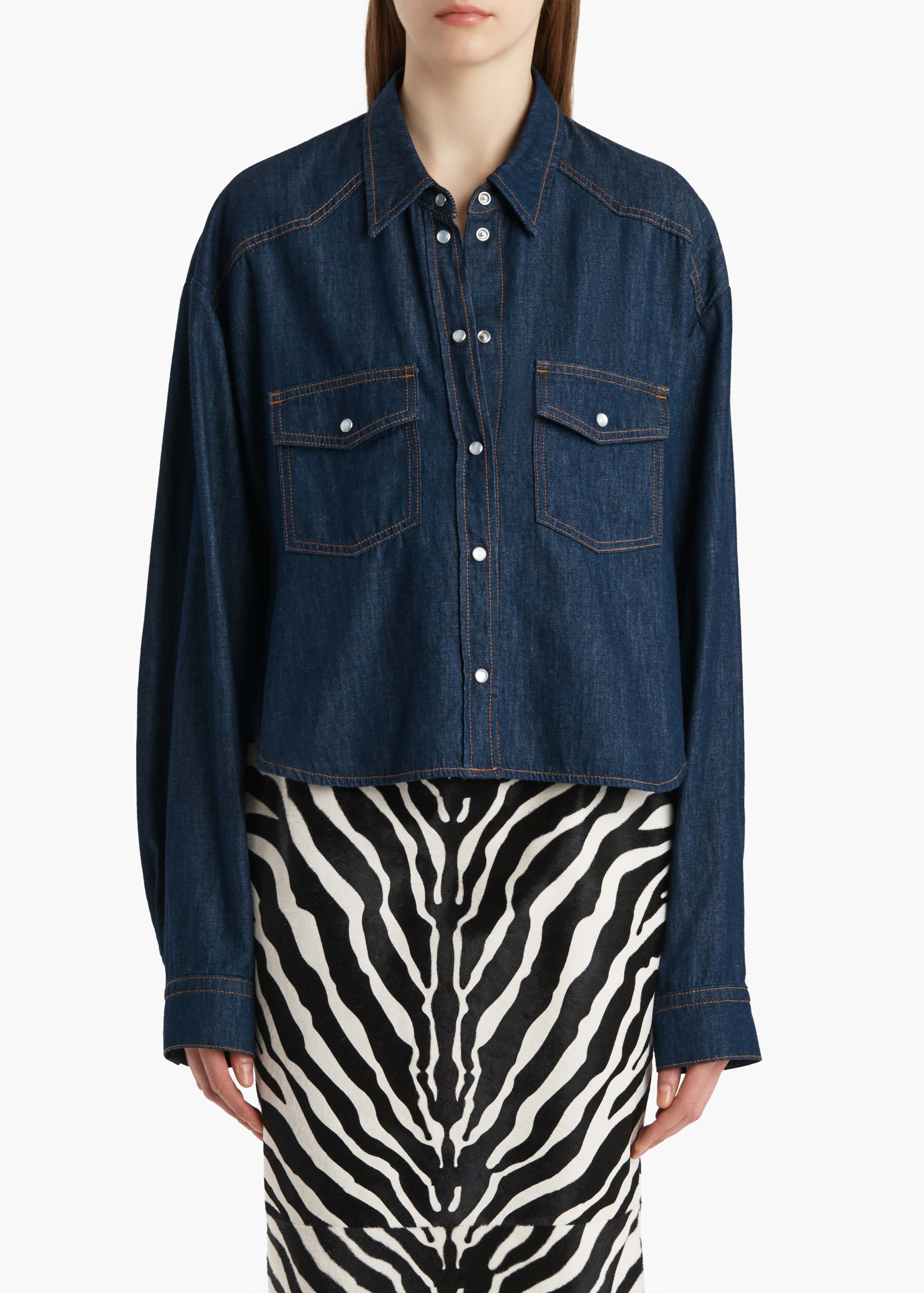 Designed for a slouchy fit, this cropped shirt accentuates the softness, lighter weight, and deep indigo hue of Japanese chambray. Shaped by Western yoke, with pearl snap closures and marigold topstitching. Angle-flap patch pocket at chest. Shirttail hem dips lower in back.