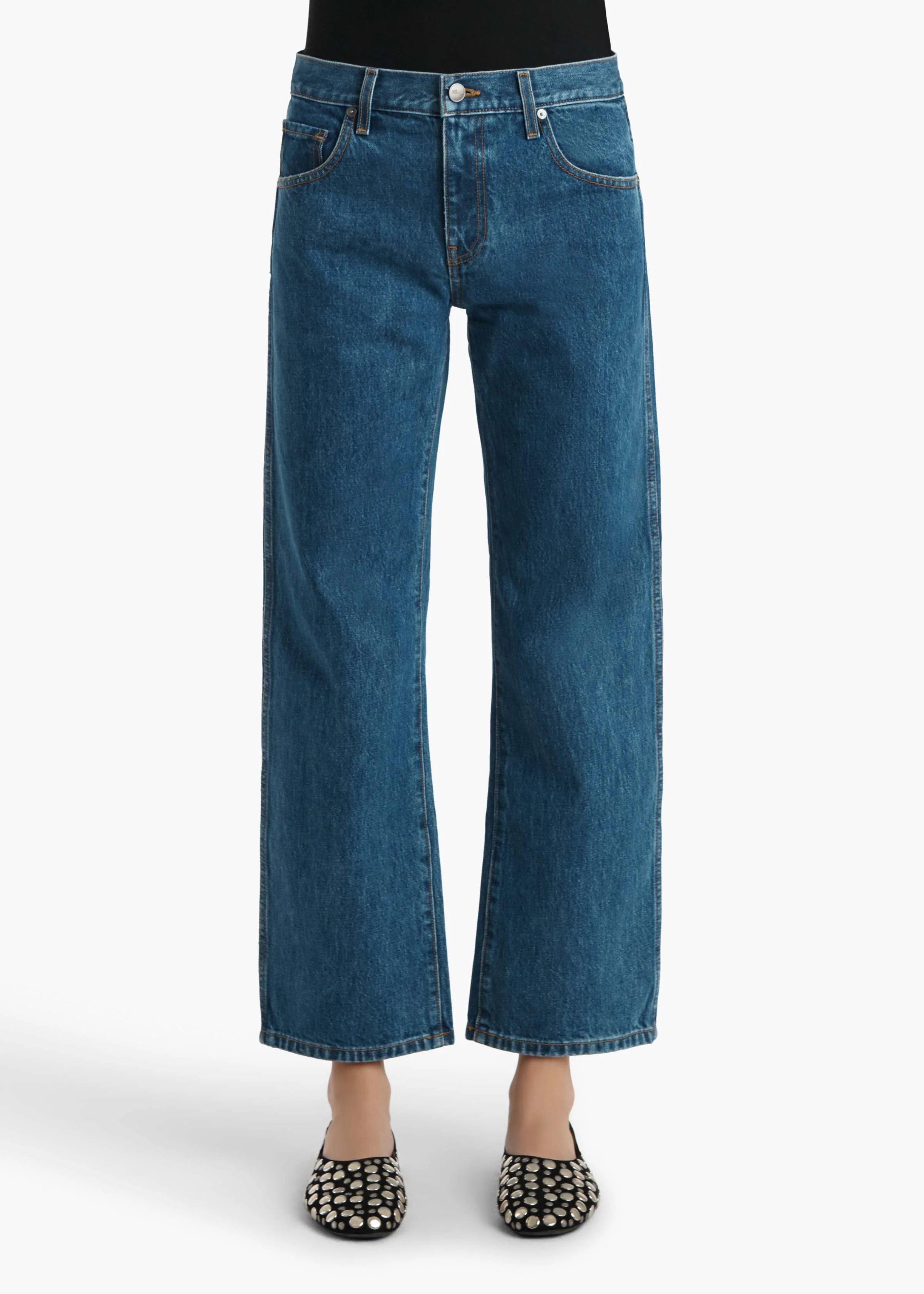 A curved inseam gives this mid-rise, wide-leg jean a flattering and feminine edge. With marigold topstitching and a signature button.