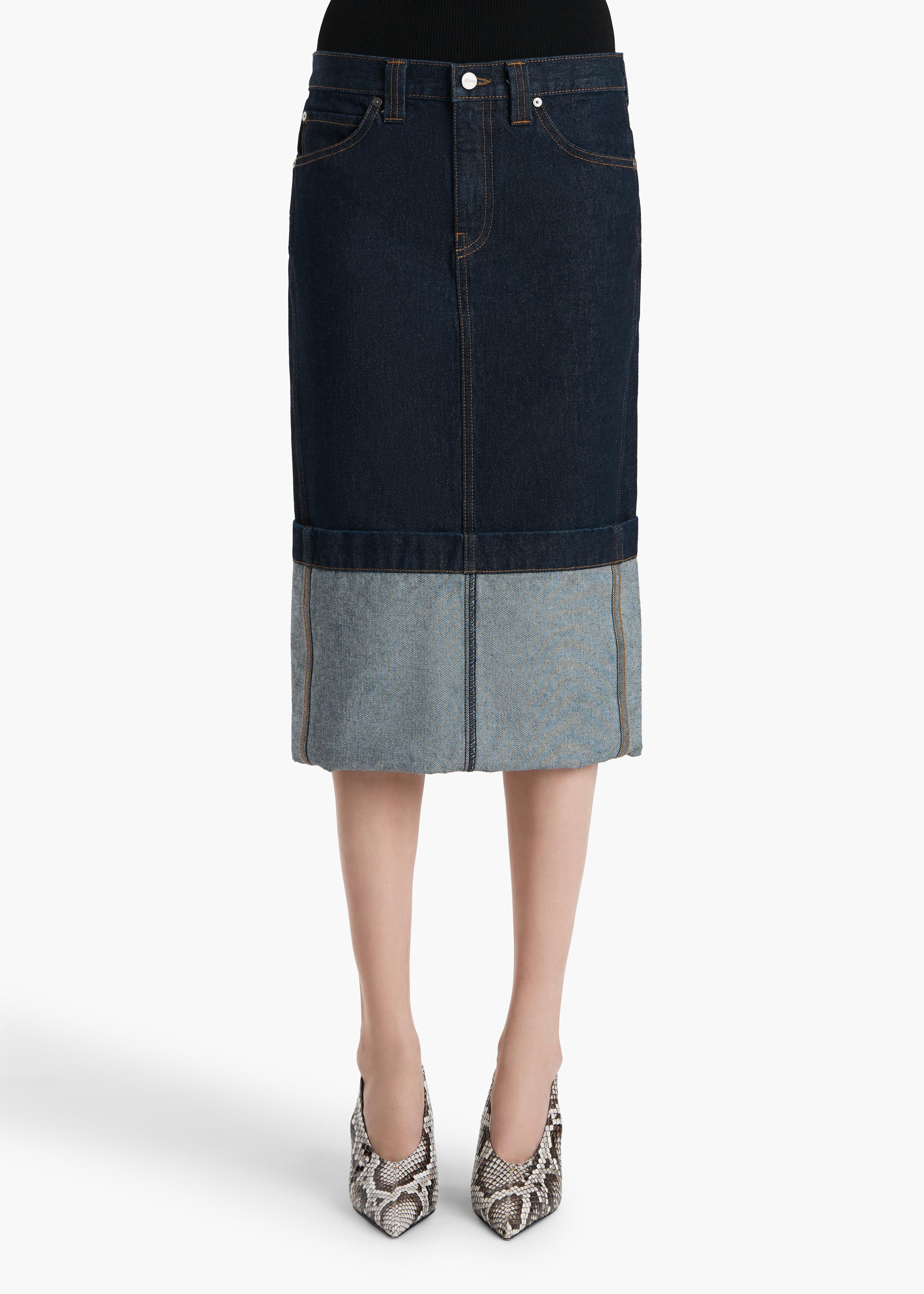 A robust and sophisticated column skirt made in Los Angeles of classic indigo denim traced by marigold topstitching. Designed to sit low on the hips for an elongating effect, the five-pocket silhouette is eased by a back vent. A tacked cuff reveals the lighter, seamed reverse. Signature nickel button.