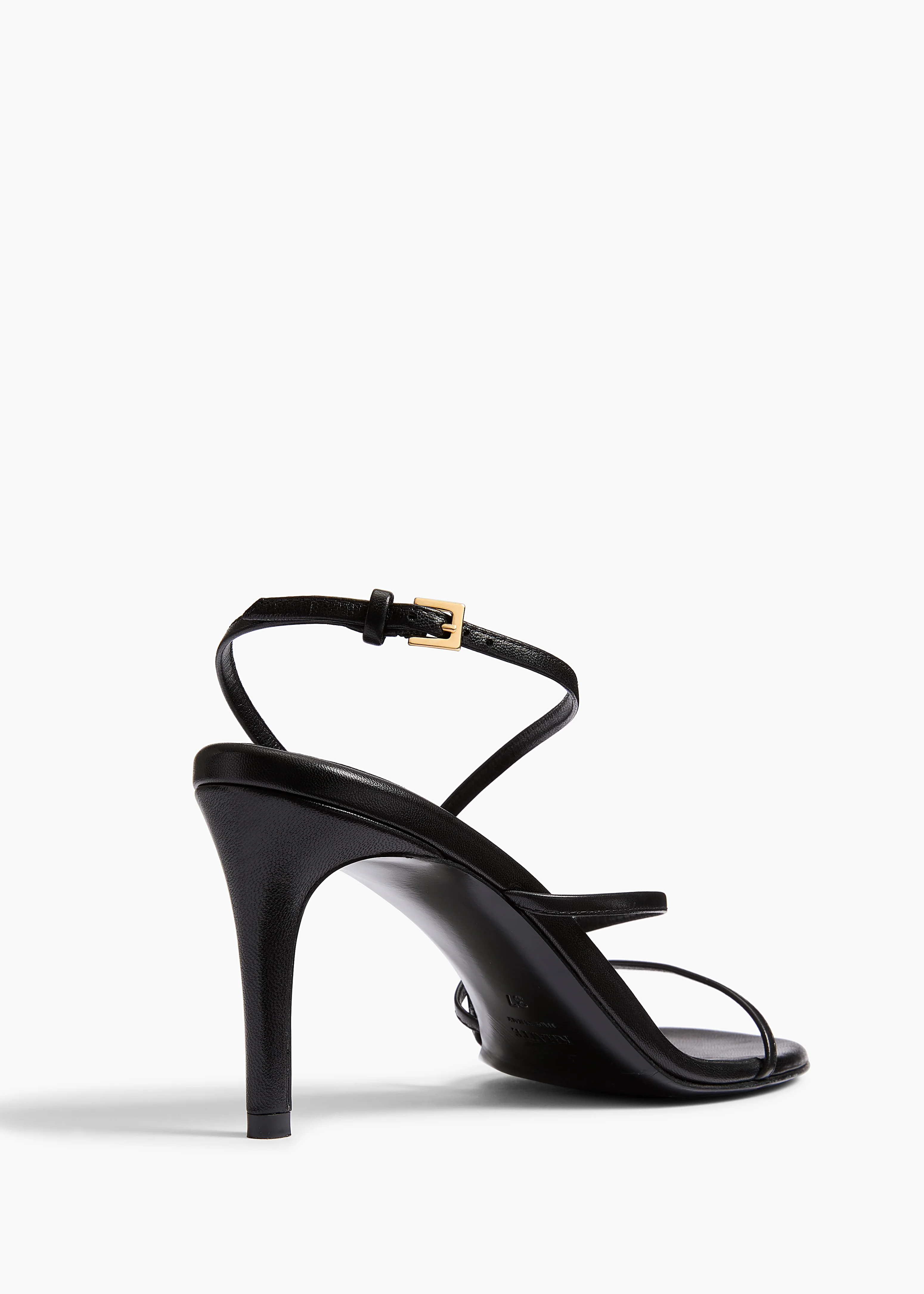A heeled sandal of lyrical lines, wrapping the foot in ribbon-like bands of leather that fasten at the ankle with a gold-toned buckle. Leather sole.