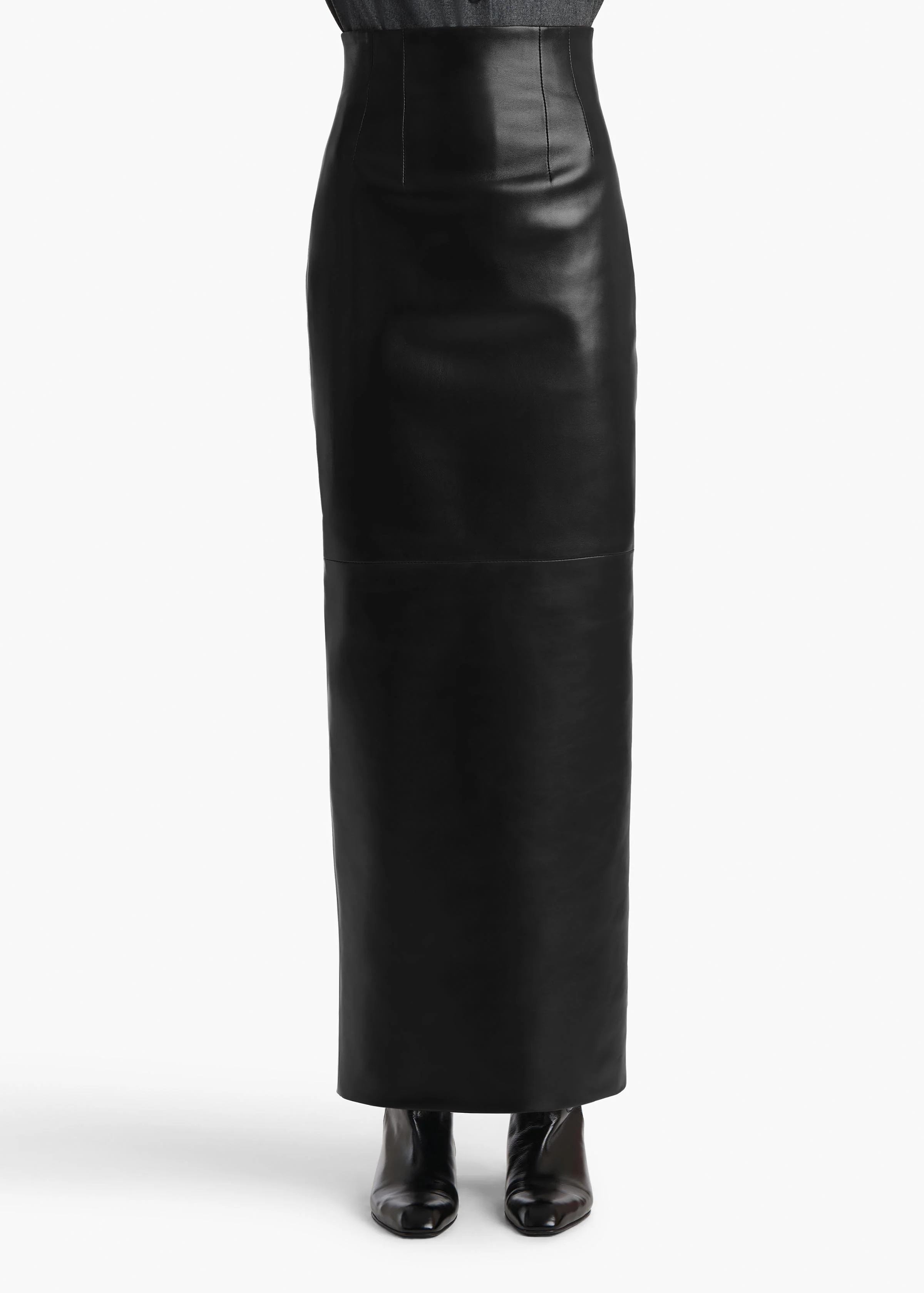 A high-waisted pencil skirt designed for a corset-like fit and shaped by darts. With a high slit and a concealed zipper closure at the back.