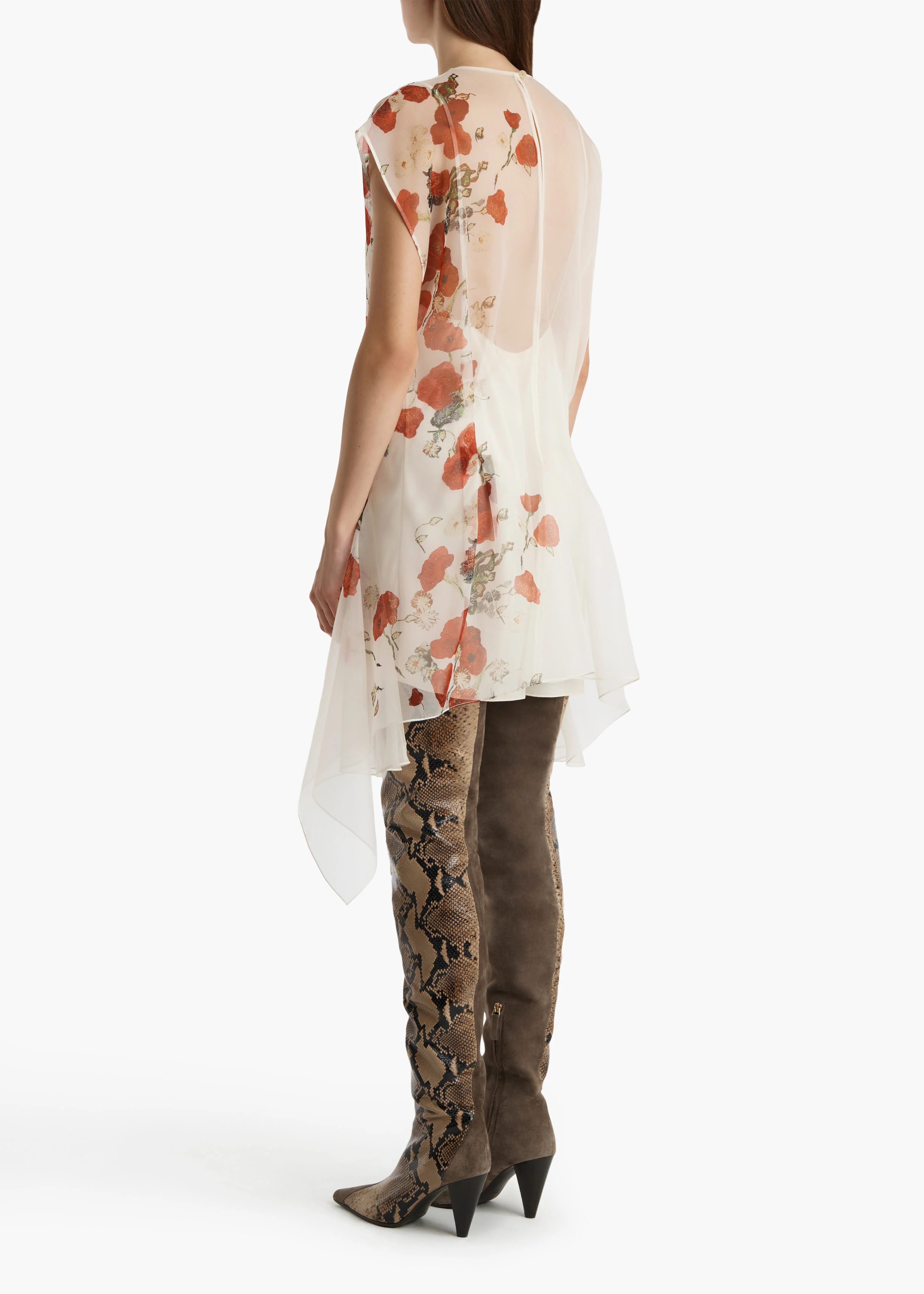 An easy-fitting and ethereal dress designed to highlight fluidly draped details, including a layered handkerchief hem. Cap-sleeved silhouette with surplice neckline. Button closure at elongated keyhole back. Includes silk slip.