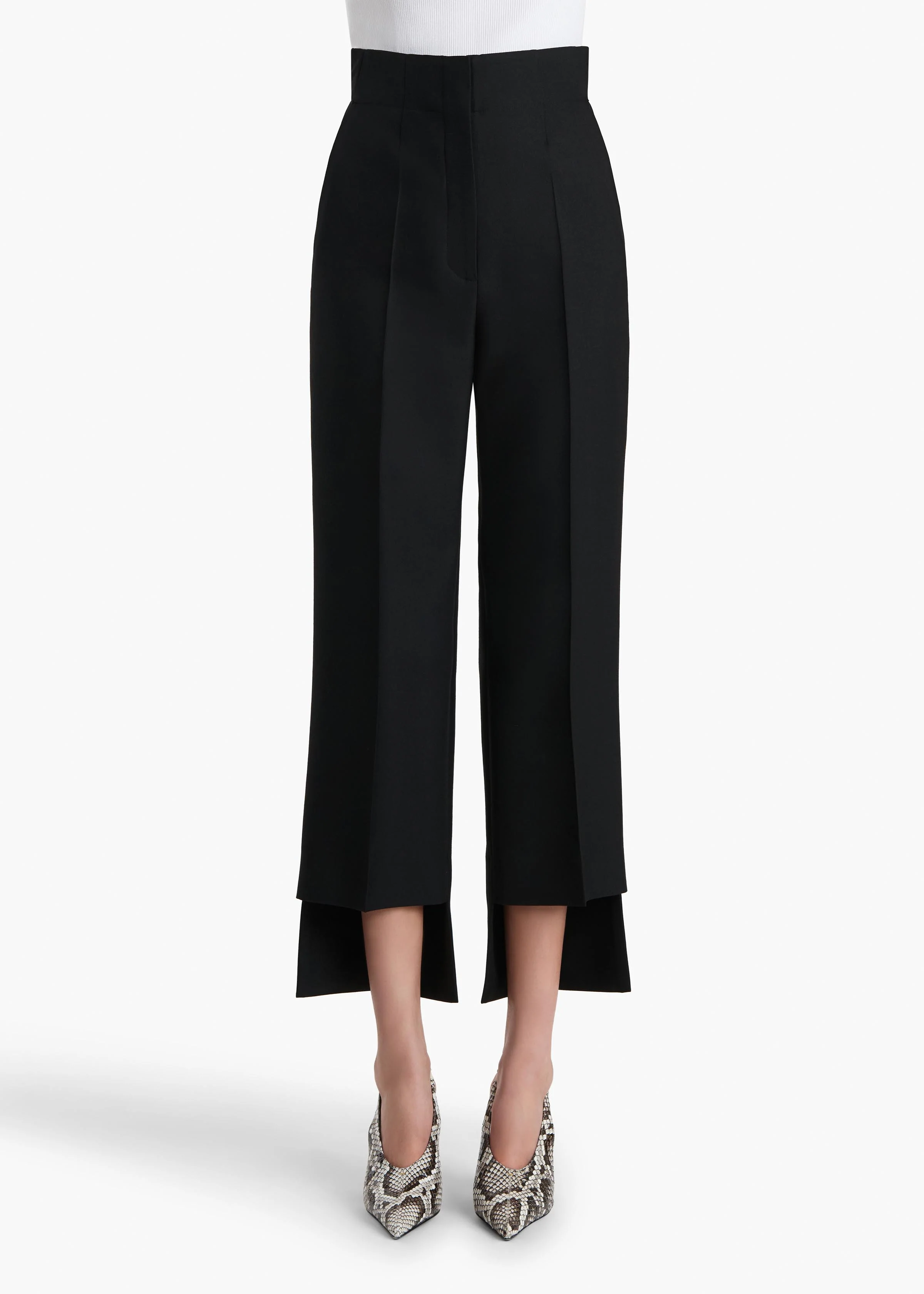 A cigarette pant elevated by a waist-defining front panel. Tailored in bonded crepe selected for its smooth, seasonless character and architectural structure. Finished with zippered fly, side pockets, a stepped hem, and back welt pocket. Lined in soft silk habotai.