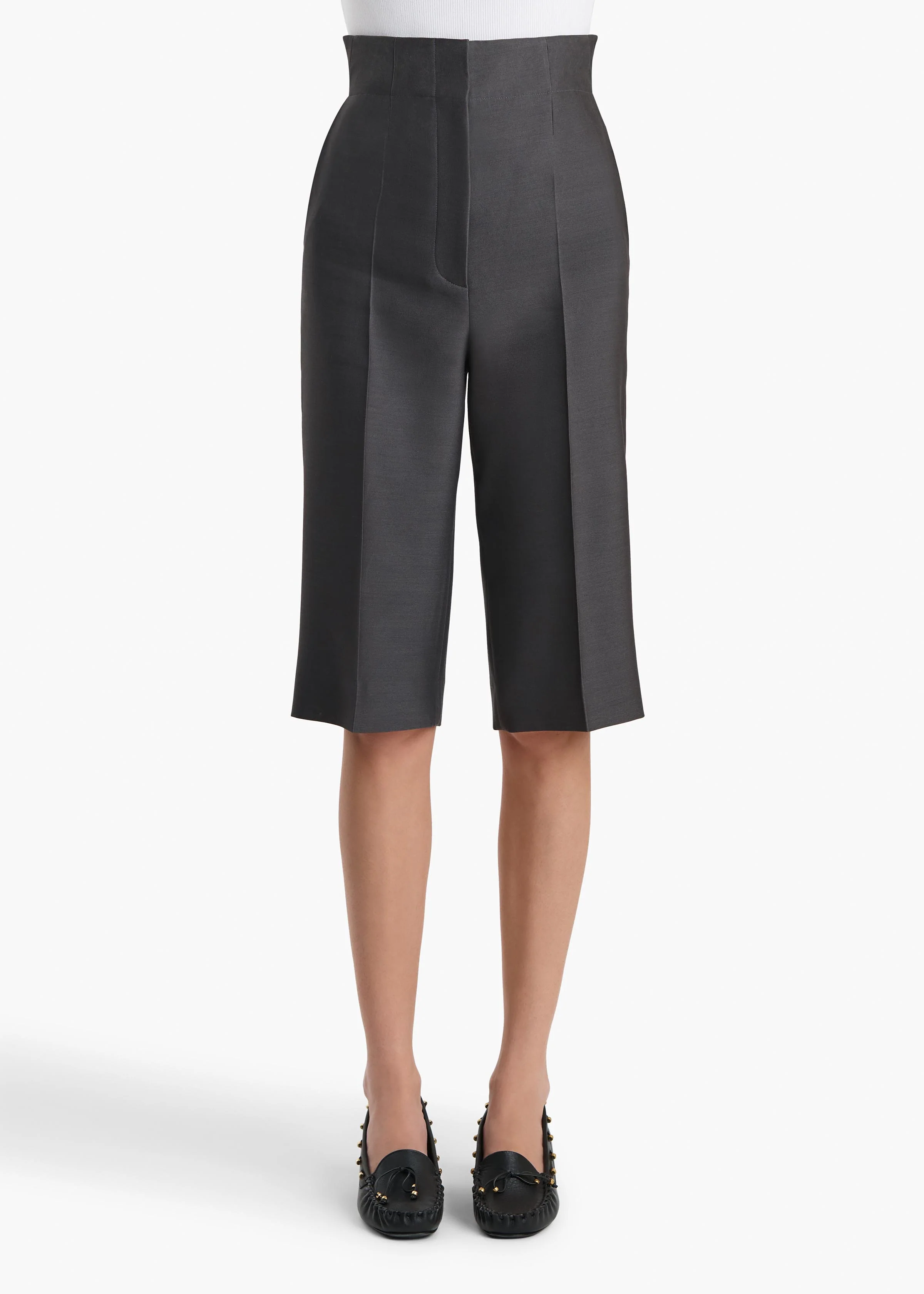 A refined interpretation of the classic capri pant, this long-line short is elevated by a waist-defining front panel. Tailored in sculptural cady selected for its rich texture, beautiful drape, and silken luster. Finished at back with belt loops and a welt pocket. Lined in soft silk habotai.