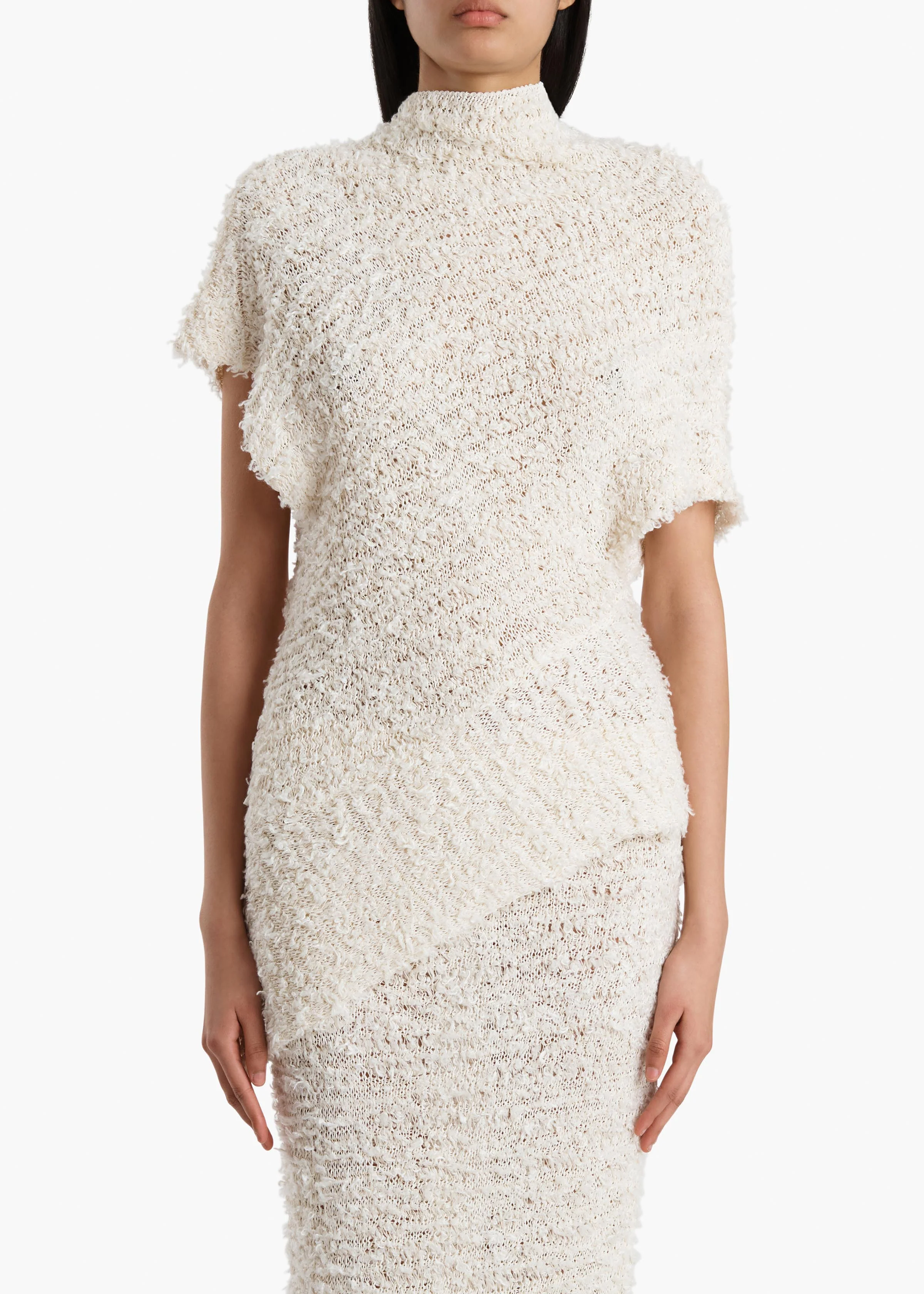A knit top of elegant asymmetry and rich tactility. Designed to envelop the body in plush, cotton-rich bouclé that is tuck-stitched for a subtle mélange effect and made in Italy. Framed by a draped stand collar. Slips on.