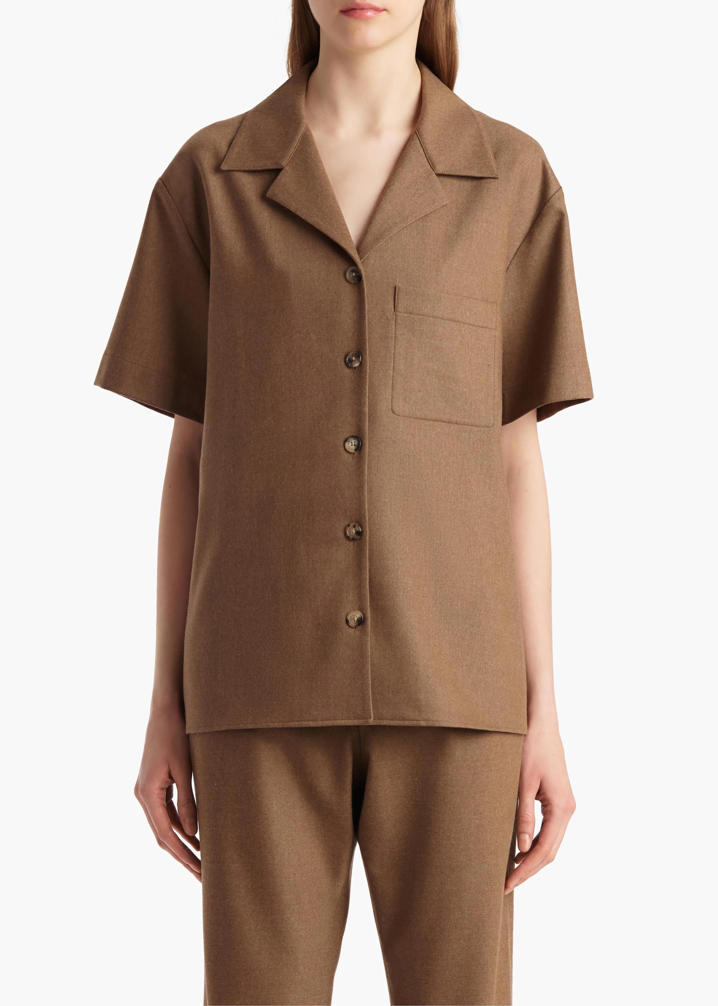 A menswear-inspired Cuban-collar shirt designed for relaxed fit in lightweight and luxurious Italian wool-cashmere shirting selected for its beautiful drape. With chest pocket, back yoke, and tortoiseshell buttons.