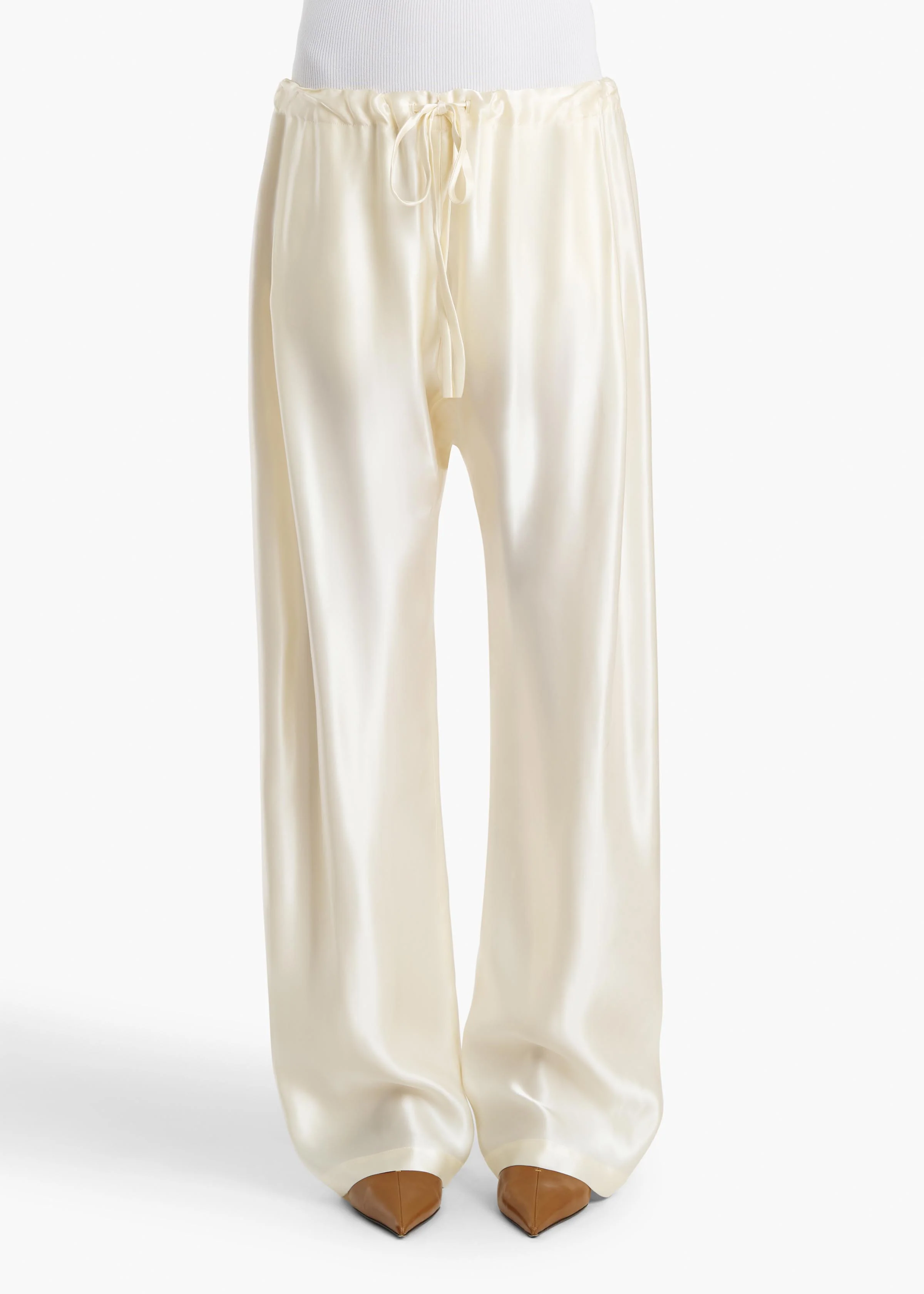 A pull-on pant that balances softness with sophistication. The relaxed, bow-leg silhouette is tailored in lightweight and luminous satin that gains enduring structure from cupro. Finished with a concealed pocket and a herringbone grosgrain tie at the elasticated waist.