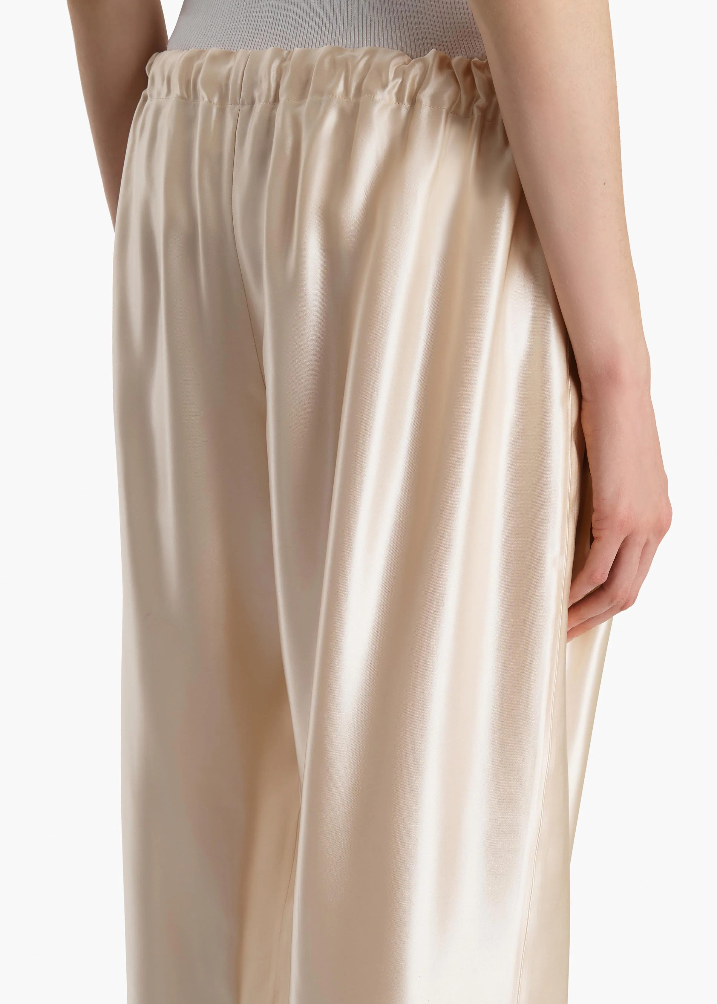 A pull-on pant that balances softness with sophistication. The relaxed, bow-leg silhouette is tailored in lightweight and luminous satin that gains enduring structure from cupro. Finished with a concealed pocket and a herringbone grosgrain tie at the elasticated waist.