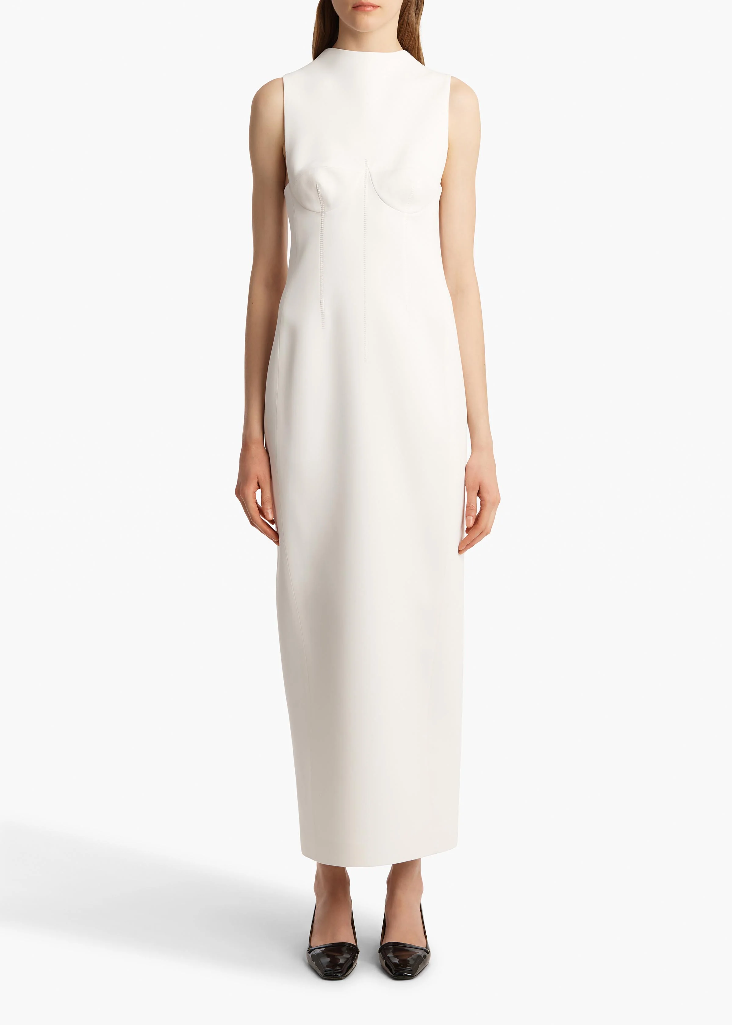 A striking, sculptural dress in bonded crepe satin selected to accentuate clean lines and tonal topstiching. With subtle stand collar and molded cups at armor-inspired bodice. Concealed zipper closure at slit back.