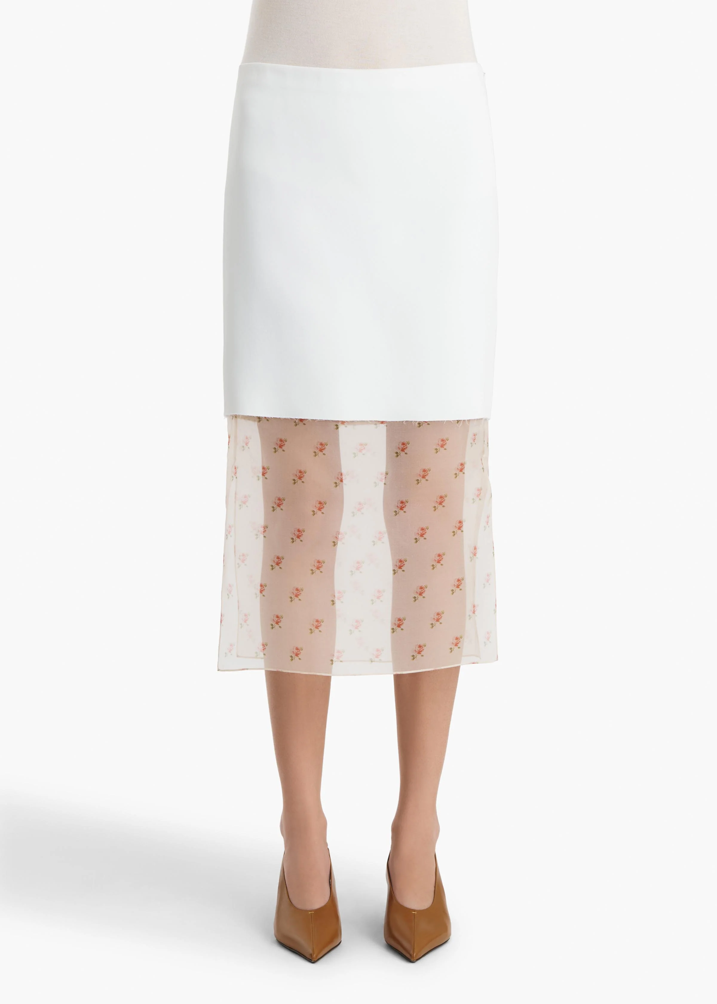 A double-layered column skirt abloom with petite roses in a playful pattern inspired by vintage motifs. Made in Italy of bonded satin crepe selected for its dense, sculptural sheen and ability to transcend seasons. The clean-front silhouette is shaped by subtle darting at back. Concealed zipper at side.
