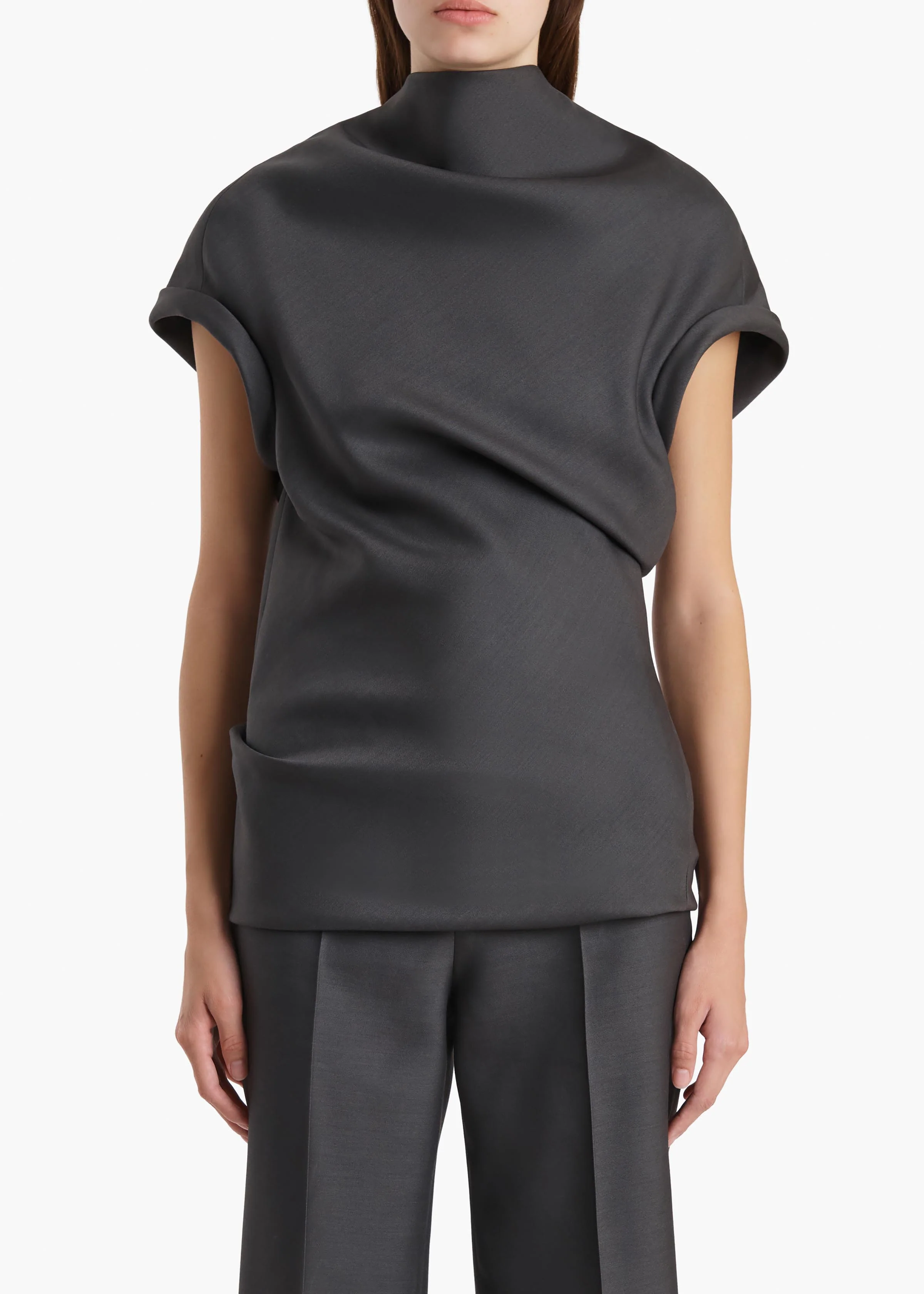 A fluid top animated by organic draping. Softly structured by sculptural cady selected for its rich texture, beautiful drape, and silken luster. The bias-cut silhouette gains its cocoon quality from a scarf-like neckline and artful twisting. Concealed zipper closure at back. Lined in soft silk habotai.