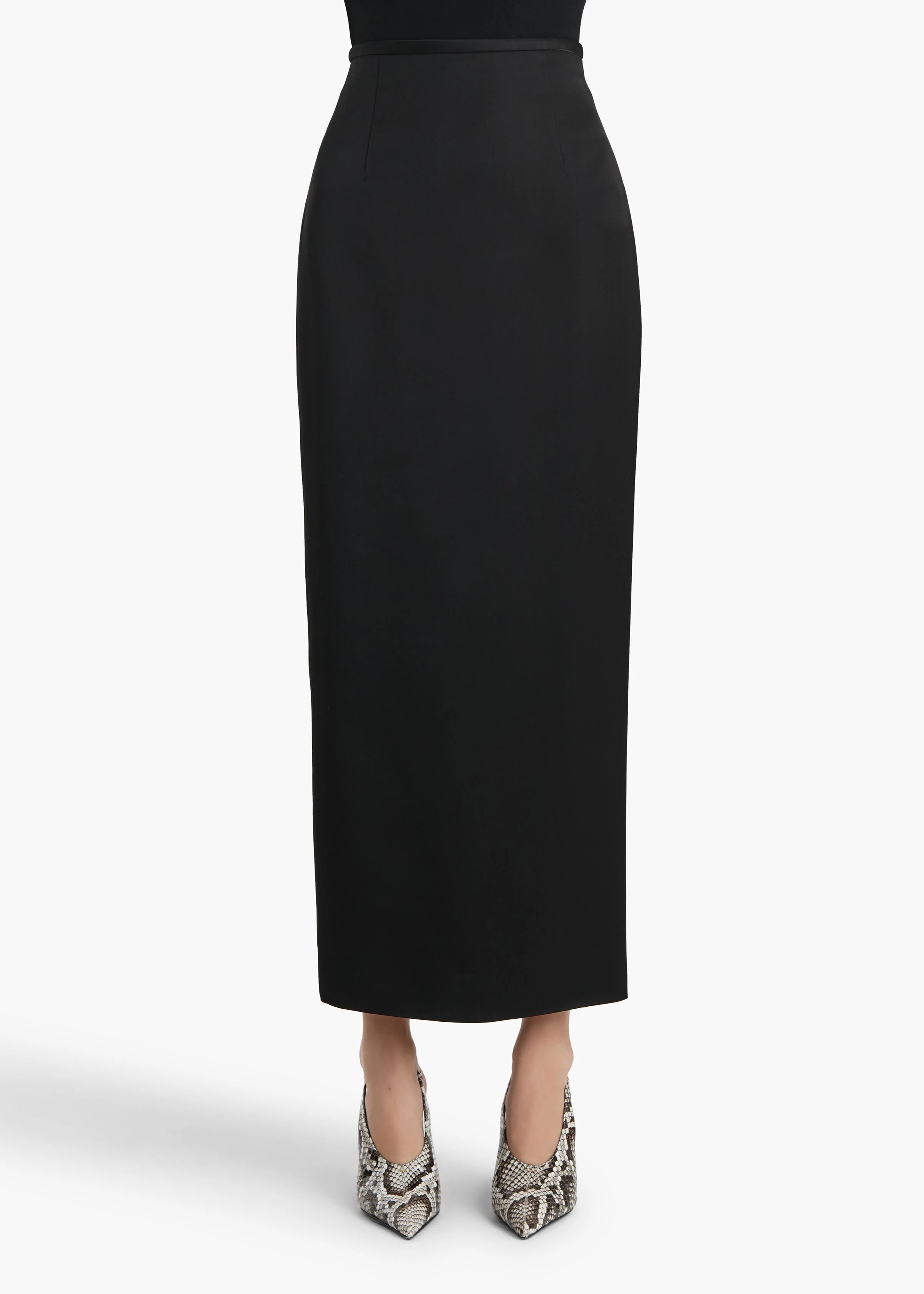 An elongated pencil skirt made in Italy of double-faced satin selected for its dramatic drape and luminous sheen. The tapered silhouette is framed by a contoured waistband and refined darts for a sleek, tailored fit. Back slit allows for ease of movement. Concealed zipper closure at back.