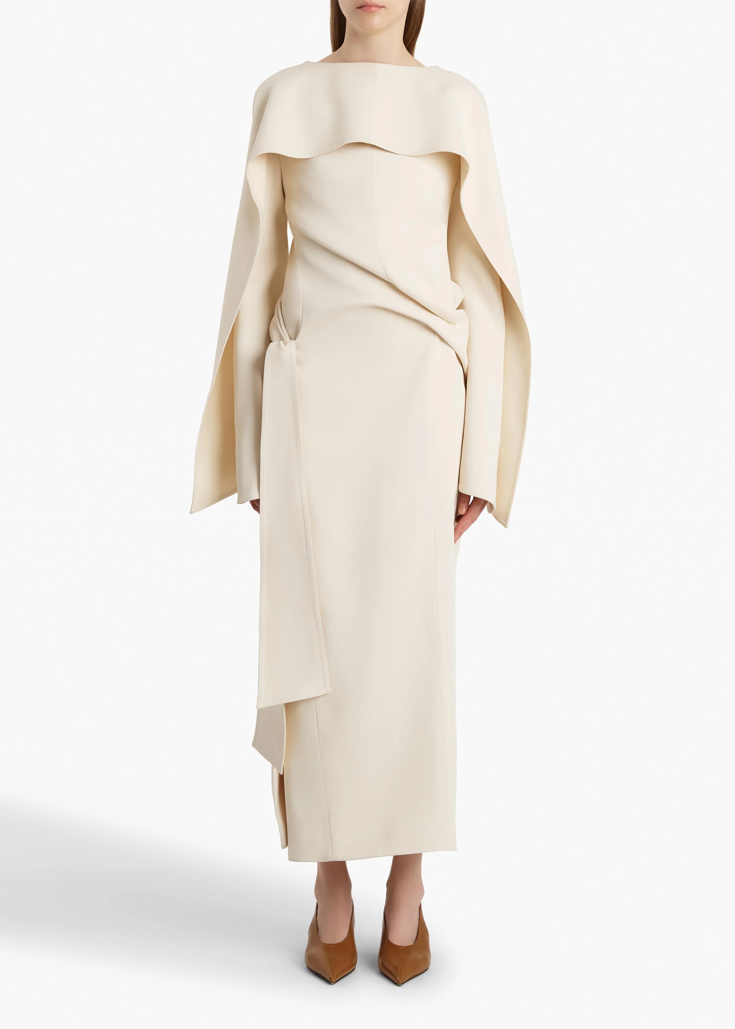 A fluid dress animated by dynamically draped layers and angled sleeves. Made in the USA of bonded crepe satin selected for its dense, sculptural sheen. An adjustable self tie at the side secures the gently tapered skirt, which is slit for ease of movement. Lined in soft silk habotai.